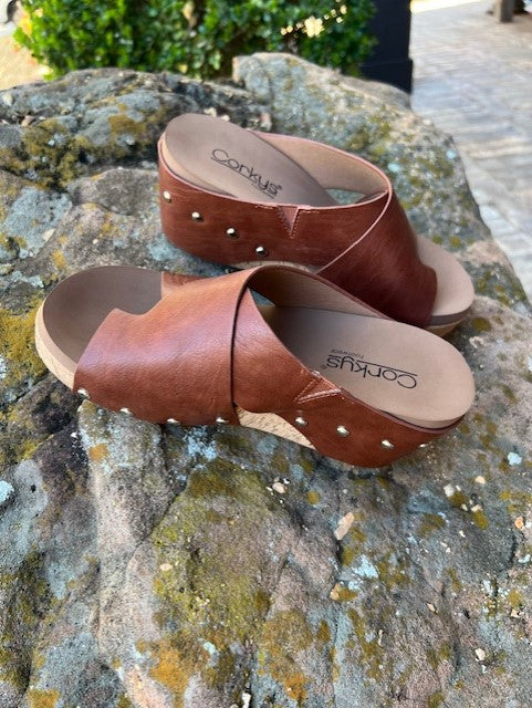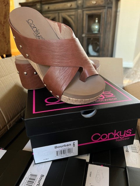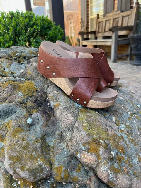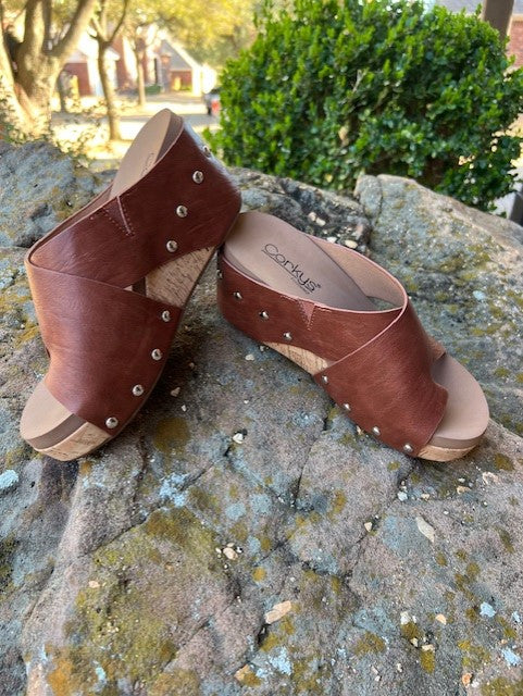 This IS the HOT new wedge/sandal from Corky's this season! Step into fierce fashion with our new Tidbit sandal in gorgeous bourbon color with silver studs. Corky's Tidbit combines style and exceptional comfort as is their brand! Perfectly pairs with jeans, skirts and shorts...pretty much everything in your closet! Walks you right into SPRING!