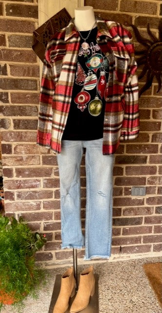 This Christmas tee has us feeling so festive! It's a beautiful short sleeve t-shirt with antique Christmas ornaments draped across the front. Deck the Halls pairs perfectly with our Feelin' it Shacket in Red and our Christmas headbands.