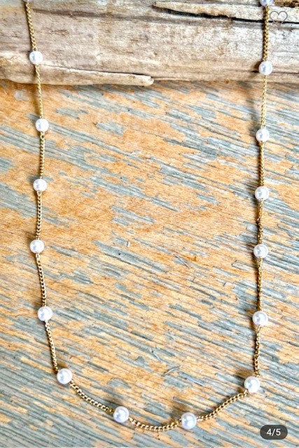 Simple elegance...this single strand, thin gold link necklace with small pearl beads will add charm to any outfit. She has a 2" extender and lobs for versatility. Length is approximately 9.5".