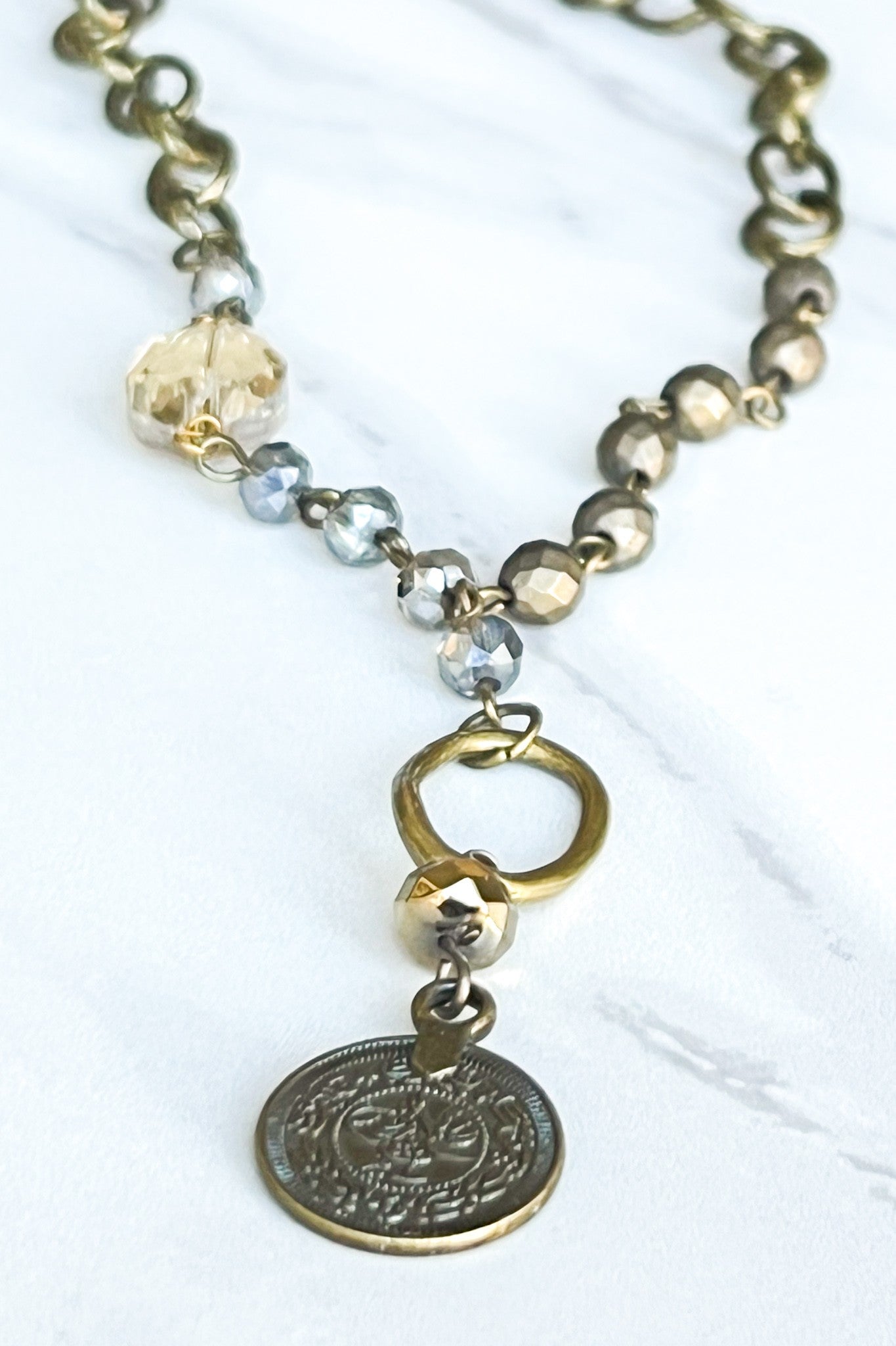 Short, lariat style necklace with intricate coin pendant.