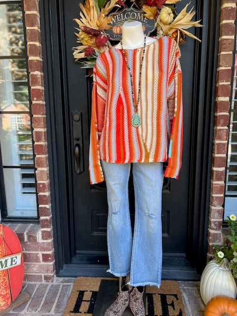 MY TRIBE SWEATER is all that we love! Orange, turquoise, brown, and cream...oh what a mix of beauty for sure! She is roomy and as soft as she is beautiful!. We're certain she'll be on your FAVORITES list!